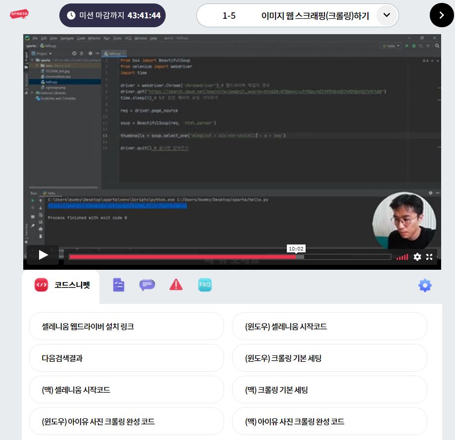 참고로, "스파르타코딩 - 파이썬 혼자놀기 패키지 힙한취미 코딩"는 파이썬 외 HTML/CSS/JAVASCRIPT수업 등 총 4개가 있는데 그중에 하나 골라서 하면 되고, 무료이다. 기간은 9월 10일부터 30일까지이며, 수업을 48시간 내에 완주해야 한다. 그런데 해보면 2시간 이내 끝낼 수 있으니, 고민하지 말고 그냥 질