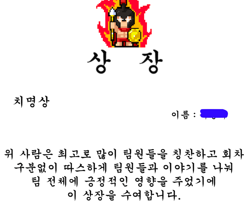 상장은 보통 다른 사람들이 "칭찬하기"에 쓴 글을 토대로 상장명과 내용을 쓰던데, 이 상은 매니저님께서 직접 쓰신 것 같다. "치명상"은 다른 사람이 썼을 수 있지만, 내용은 확실히 매니저님이 쓰신 것 같다.