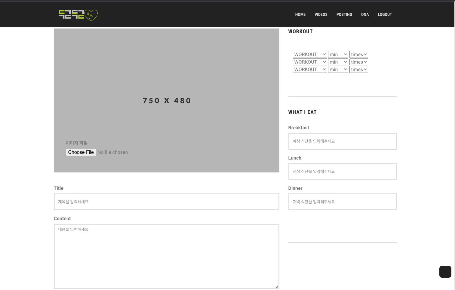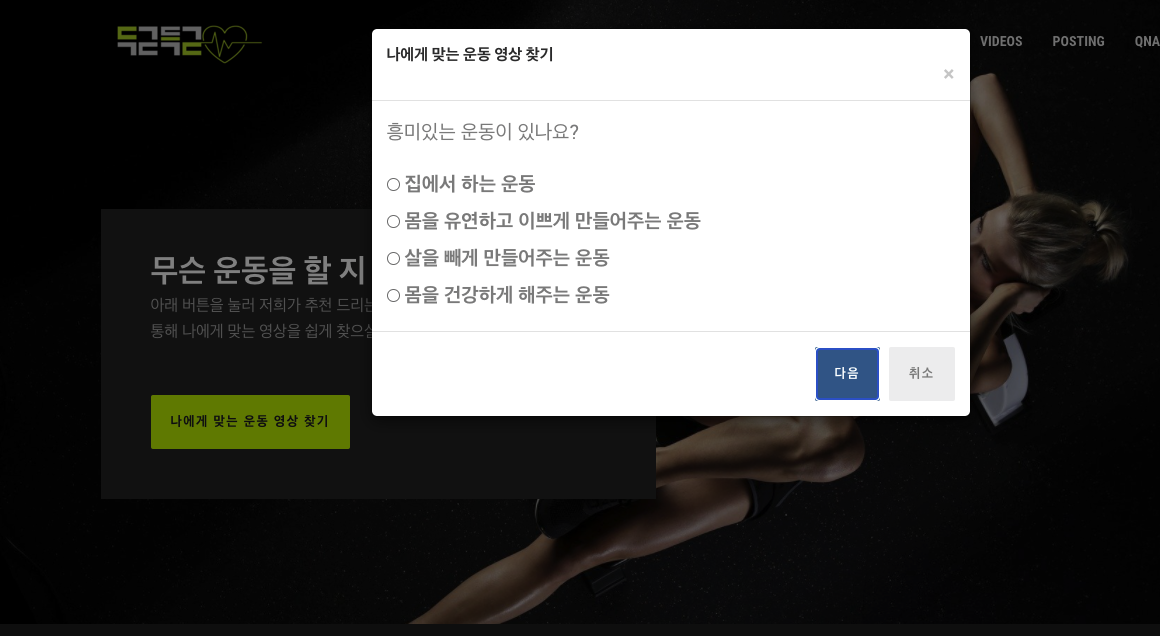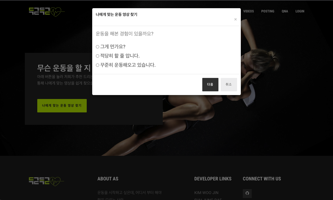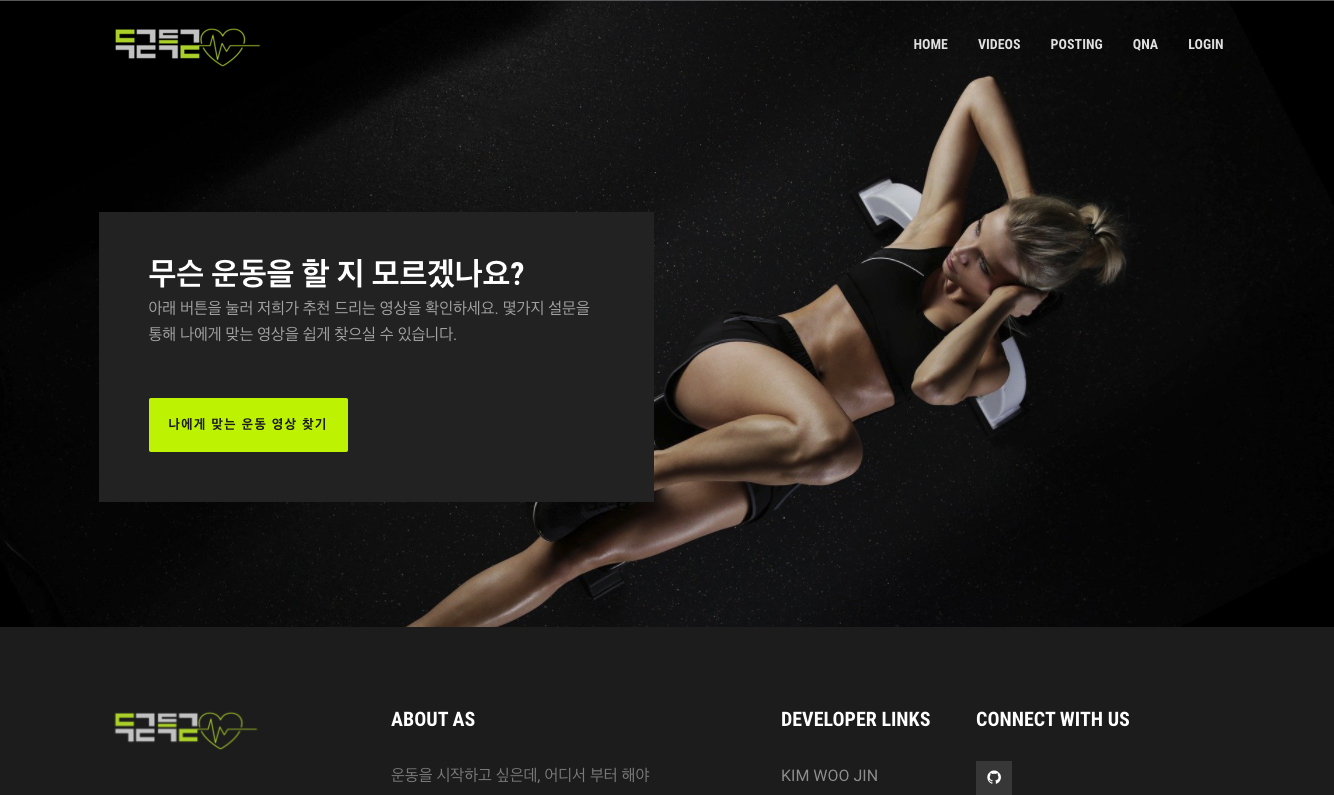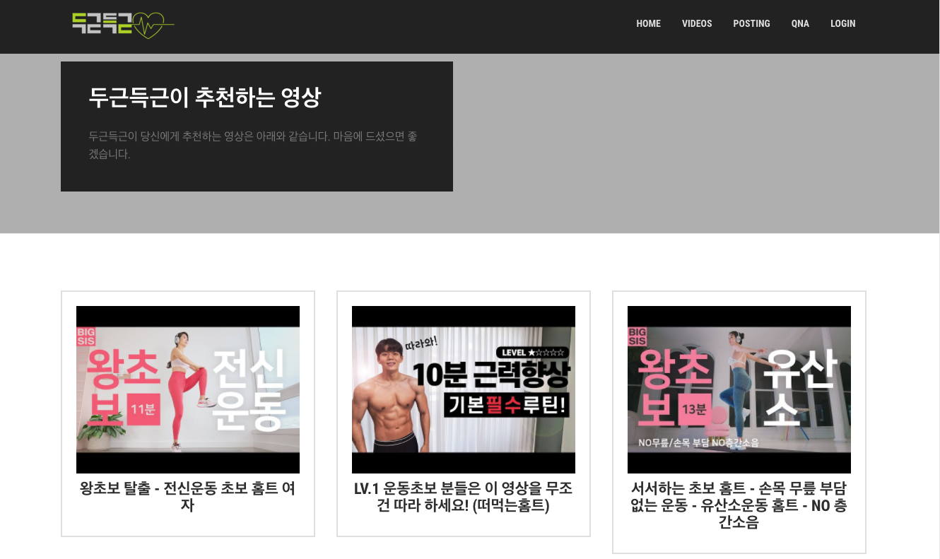 우리 프로젝트 이름은 "두근득근"이다. 운동을 하고 싶으나 어디서부터 시작해야 할지 모르는 사람들에게 운동영상과 정보를 제공해주는 웹사이트다. 영상은 유튜브에서 선별해서 가져왔다. YouTube API만으로 영상을 자동 선별하는 것은 아무래도 Machine Learning을 동원해야 하는 것 같아서 직접 영상을 선별해서 주소를 가져와서 DB에 저장을 했다.