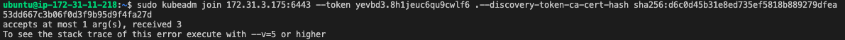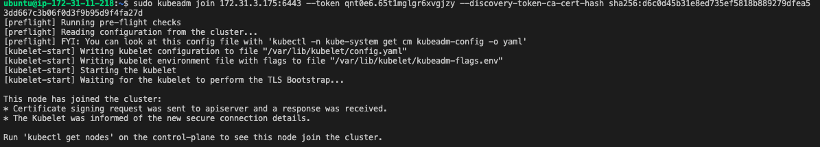 ubuntu@ip-172-31-11-218:~$ sudo kubeadm join 172.31.3.175:6443 --token yevbd3.8h1jeuc6qu9cwlf6 .--discovery-token-ca-cert-hash sha256:d6c0d45b31e8ed735ef5818b889279dfea53dd667c3b06f0d3f9b95d9f4fa27d