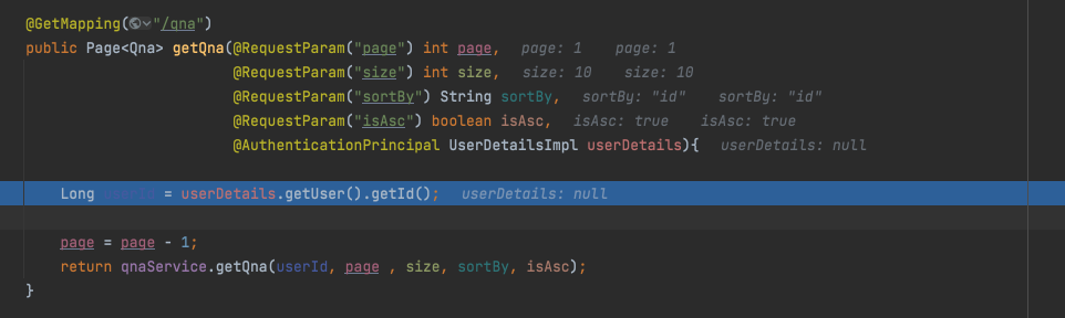 userDetails를 삭제한다. 프론트에서 호출 다시 해본다.